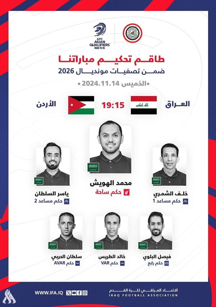 وأضاف، أنه “سيقود مواجهة منتخبنا الوطنيّ و الأردن في البصرة بتأريخ (14/11) الساعة السابعة والربع مساءً (19:15) طاقم تحكيمي سعودي بقيادة الدوليّ محمد الهويش ويساعده كل من خلف الشمري و ياسر السلطان وفيصل البلوي حكماً رابعاً”.